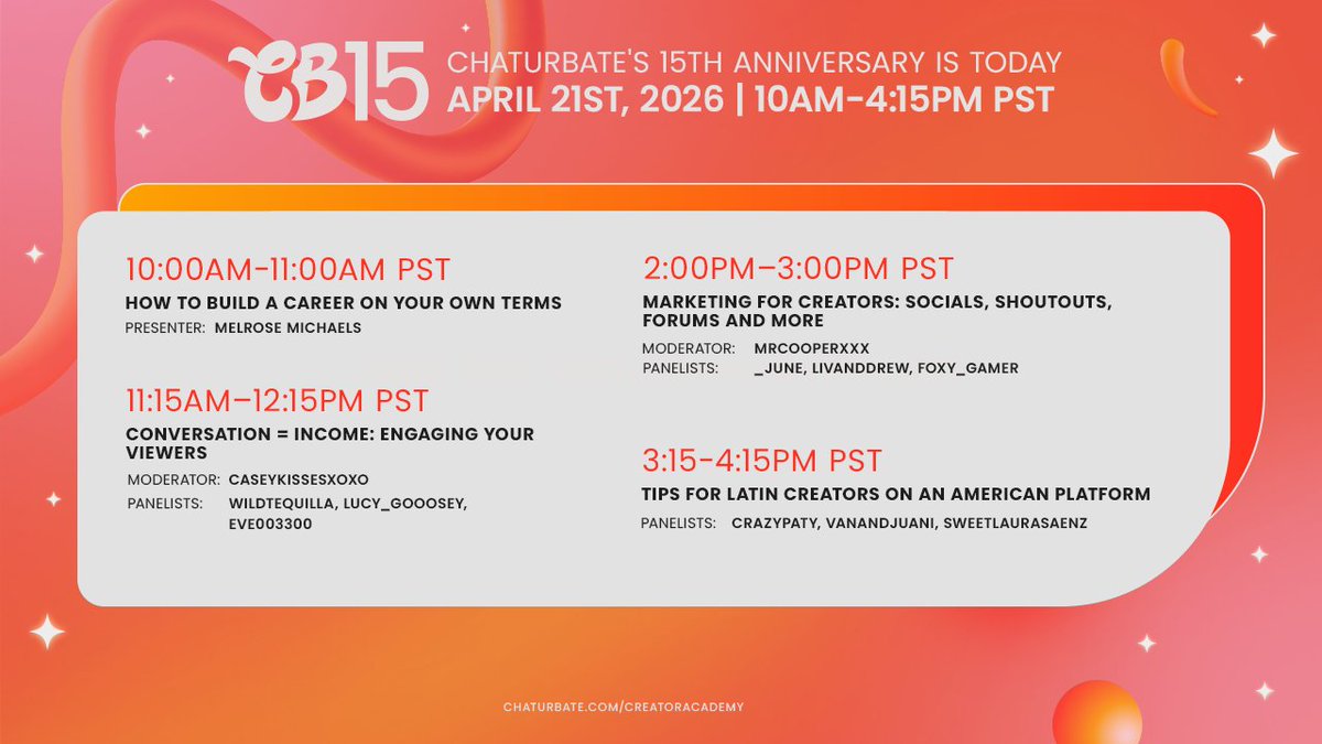 Chaturbate,’s 15 Year Anniversary event is almost here and we cannot wait to celebrate with our incredible creator community! If you’re not able to attend CB15, we’ll be streaming four workshops live on April 21st at  chaturbate.com/creatoracadem…. Tune in for valuable insight from our experts and join us in celebrating 15 years!